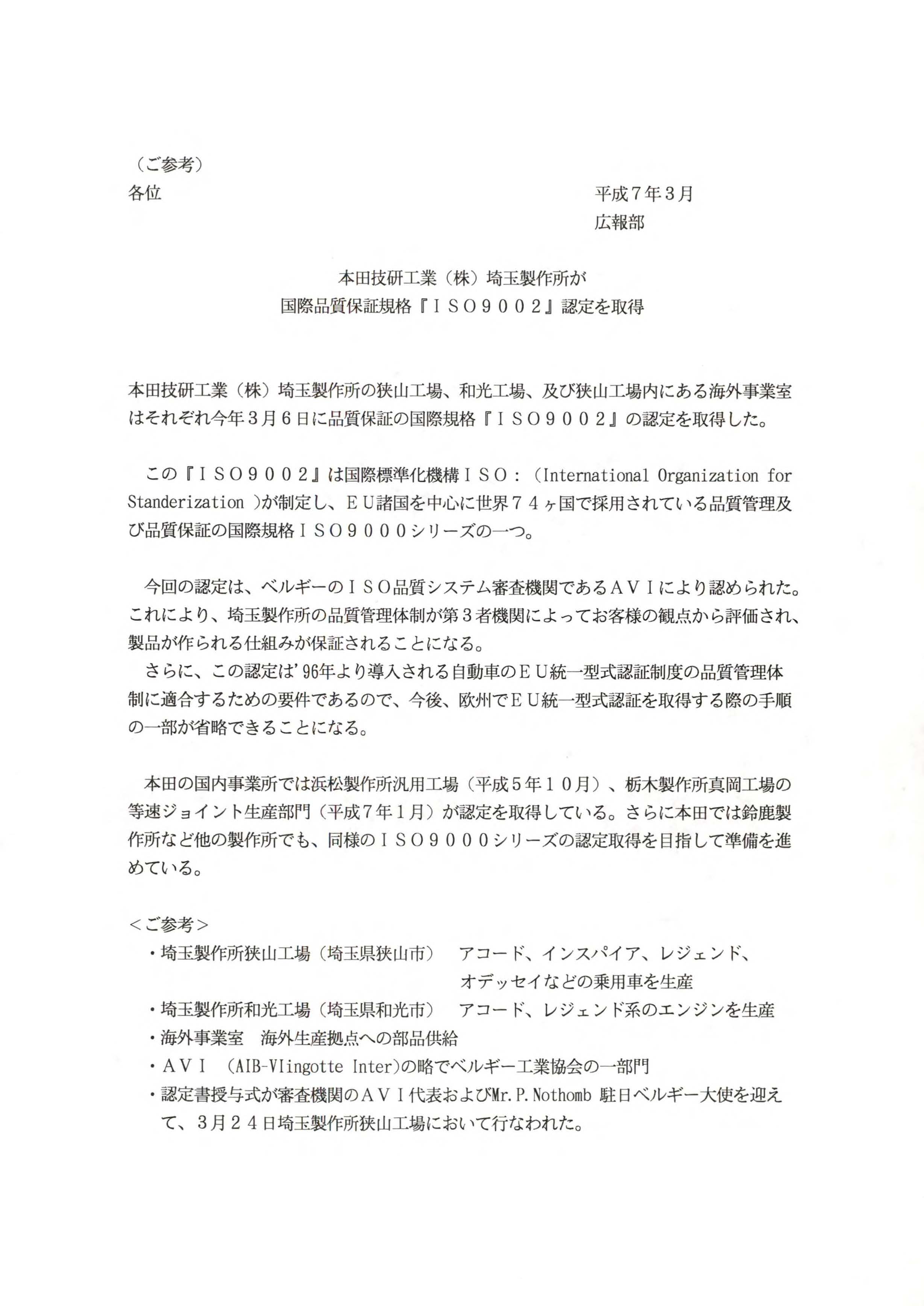 本田技研工業(株)埼玉製作所が国際品質保証規格『ISO9002』認定を取得