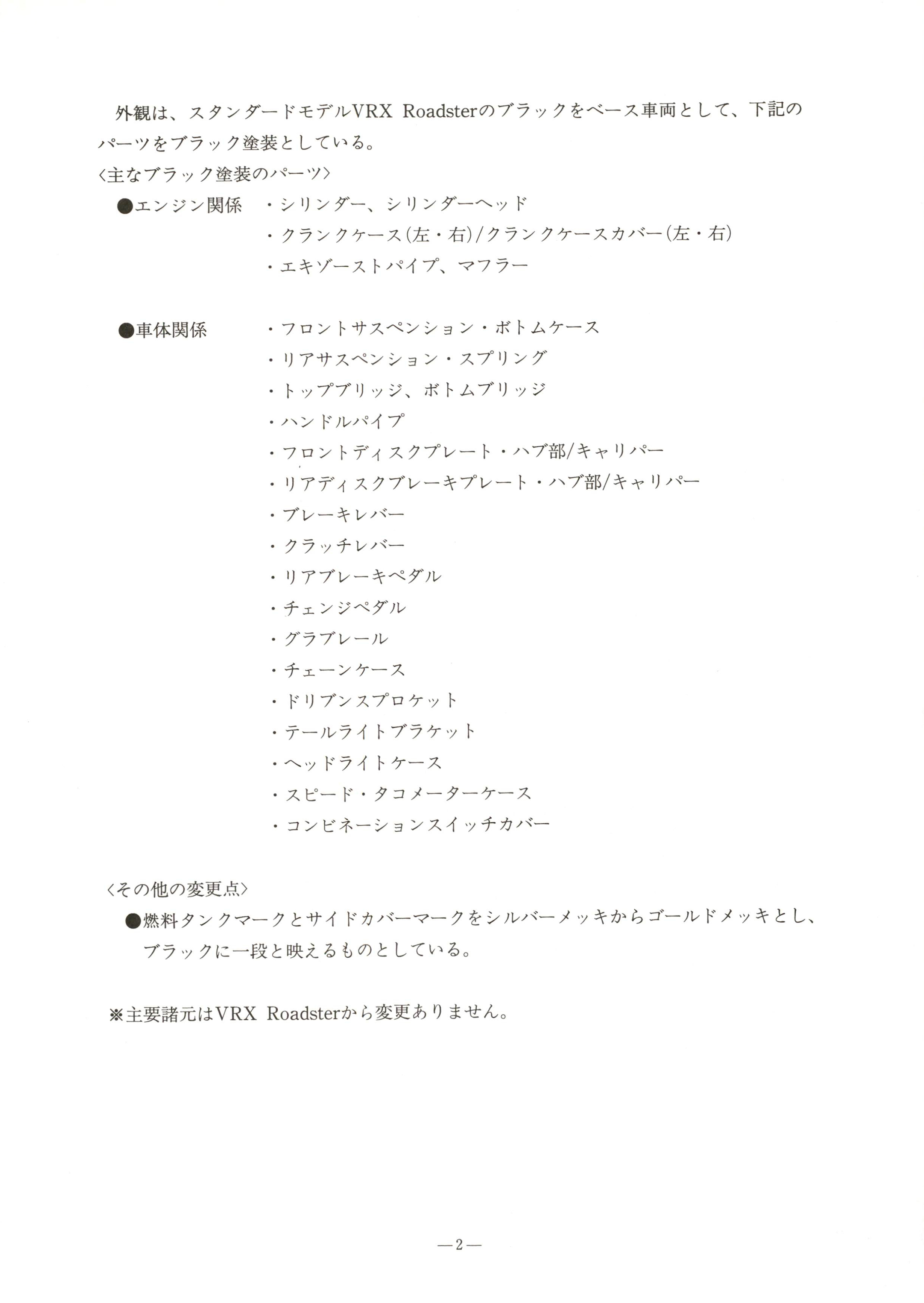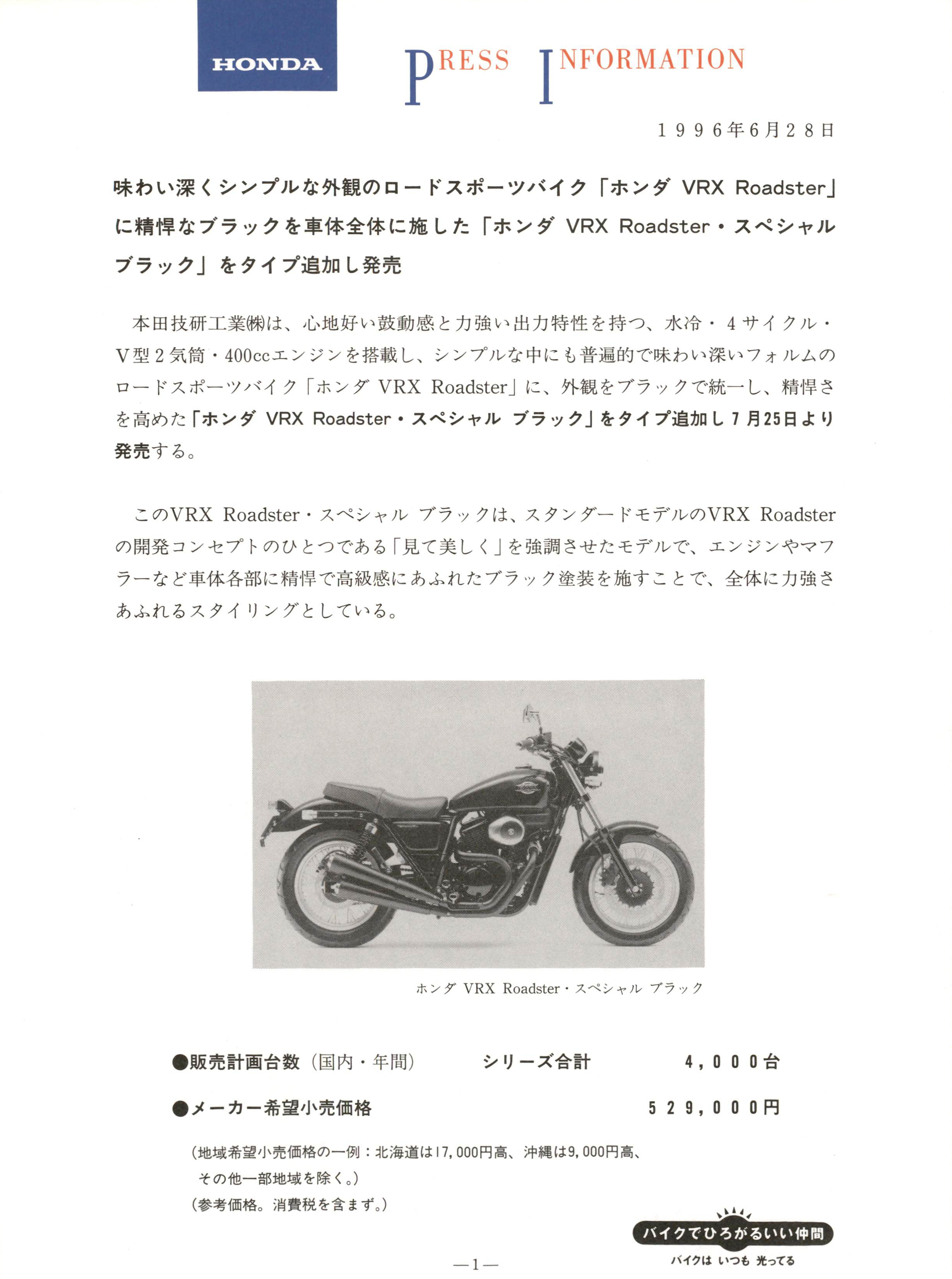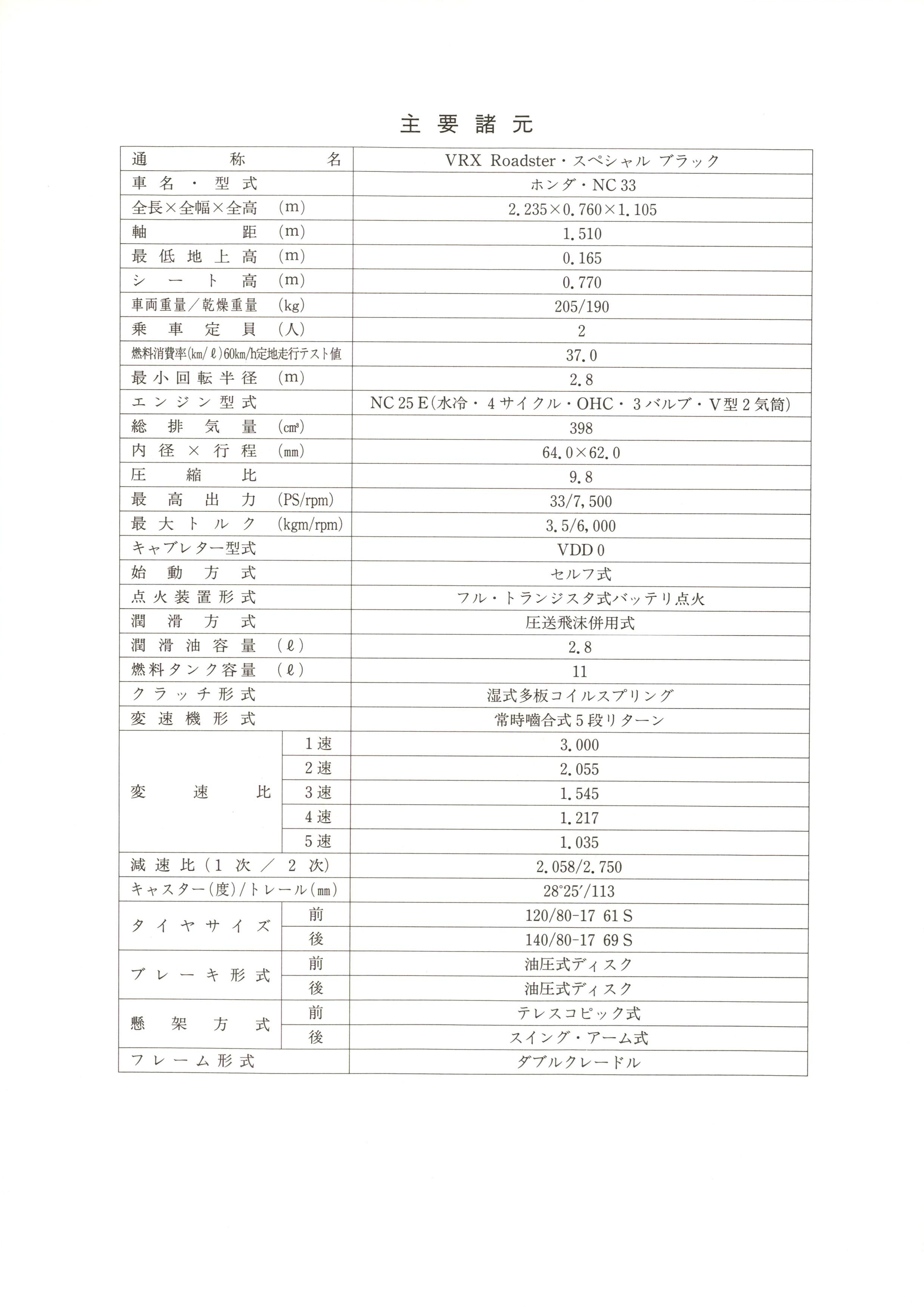 n o n J D ^P RESS I NFORMATION1 9 9 6 年 6 月 2 8 日味わい深くシンプルな外観のロードスポーツバイク「ホンダ V R X Roads t er 」に精惇なプラックを車体全体に施した「ホンダ V R X Roads t er•スペシャルプラック」をタイプ追加し発売本田技研工業腕は、 心地好い鼓動感と力強い出力特性を持つ、水冷 . 4 サイクル ・V 型 2 気筒 . 400cc エンジンを搭載し、シンプルな中にも普遍的で味わい深いフォルムのロー ドスポーツバイク「ホンダ V R X R oads t er 」に、外観をプラックで統一 し、 精 I 旱さを高めた 「ホンダ V R X Roadster ・スペシャルプラック」をタイプ追加し 7 月 25 日より発売す る。この V R X Roads t er ・スペシャルブラックは、スタンダード モデルの V R X R oads t erの開発 コンセプトのひとつである「見て美しく」を強調させたモデルで、エンジンやマフラーなど車体各部に精惇で高級感にあふれたブラ ック塗装を施すことで、全体に力強さあふれる スタイリングと している 。!i T, 、 ¥ホンダ V R X Roads t er ・スペシャルプラック●販売計画台数 (国内 ・年間)●メーカー希望小売価格シリーズ合計(地域希望小売価格の一例 :北海道は 17,000 円高、沖縄は 9,000 円高、その他一部地域 を除 く。)4, 0 0 0 台5 2 9 , 0 0 0 円(参考価格。消費税を含 まず。)- 1 -“ “ 心 ゜ 迦 暉 i 心 ~ハイクはいつも光ってる外観は、スタンダードモデル VRX Roads t er のプラ ックをベース車両 として、下記のパーツをプラ ック塗装としている。く主なプラ ック塗装のパーツ〉●エンジン関係 ・シリ ンダー、シリ ンダーヘ ッ ド●車体関係くその他の変更点〉・クランクケース (左 ・右)/クランクケースカバー(左 ・右)・エキゾーストパイプ、マフラー・フロントサスペンション ・ボトムケース・リアサスペンション ・スプリング・トップブリ ッジ、ボトムブリ ッジ・ハンドルパイフ゜・フロ ン トディスクプレート ・ハプ部/キャリパー・リアディスクブレーキプレート ・ハブ部/キャリパー・ブレーキレバー・クラ ッチレバー・リアプレーキペダル・チェ ンジペダル・グラブレール・チェーンケース・ドリブンスプロケット・テールライトブラケ ッ ト・ヘ ッドライトケース・スピード ・タコメーターケース・コンビネーションスイ ッチカバー●燃料タンクマークとサイドカバーマー クをシルバーメ ッキからゴールドメ ッキと し、ブラ ックに一段と映えるものとしている。※主要諸元は V RX Roads t er から変更ありません。- 2 -主 要 諸 尤通 称 名 V R X Roads t er ・スペシャルブラ ック車 名 型 式ホンダ•NC33全長 x 全幅 x 全高(m )2. 235 X 0. 760 X 1. 105軸 距(m )1. 510最 低 地 上 高(m ) o . 165シ 卜 高(m)0. 770車両重量/乾燥重量 (k g) 205/190乗 車疋 ,-,....員 (人) 2燃料消費率 (km/ Q) 60km /h定地走行テスト値 37.0最 小 回 転 半 径 ( m) 2. 8エ ン ジ ン 型 式 N C 2 5 E (水冷.4サイクル•OHC•3バルブ•V 型 2 気筒)総 排 気 量 (c 而) 398内 径 X 行 程 (mm) 64. 0 X 62. 0圧 縮 比 9. 8最 高 出 力 (PS/r p m) 33 /7 ,500最 大 卜 ル ク (k g m/rp m) 3.5/6,000キャプレター型式 V D D O始 動 方 式 セルフ式点 火 装 置 形 式 フル・トランジスタ式バ ッテリ点火潤 滑 方式 圧送飛沫併用式潤 滑 油 容 羅 (Q ) 2.8燃 料 タ ン ク 容 量 (Q) 11ク ラ ッ チ 形 式 湿式多板コイルスプリング変 速 機 形 式 常時噛合式 5 段リターン1 速 3.0002 速 2.055変 速 比 3 速 1. 5454 速 1. 2175 速 1. 035減 速 比 (1 次 / 2 次) 2.058/2. 750キャスター (度) / トレール (mm) 2 8 ° 25'/113タ イ ヤ サ イ ズ即 9 9120/80-17 61 S後 140/80-17 69 Sプ レ ー キ 形 式即 9 9油圧式ディスク後 油圧式ディスク懸フ カロ方 式月 9 9 1 Jテレスコピ ック式後 スイング・アーム式フ レ ー ム 形 式 ダプルクレードル