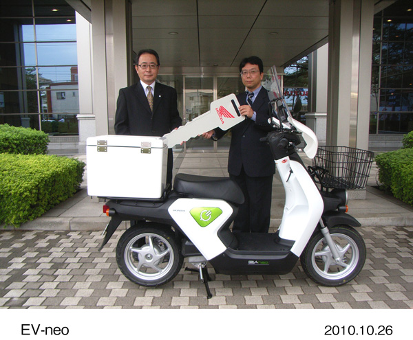 Hondaは、2010年12月にリース販売を予定している電動二輪車「EV-neo(イーブイ・ネオ)」のテスト運用を開始しました。このテスト運用は12月のリース販売を前に、業態の異なる数社の協力企業に試作車を順次貸与し、公道を使った実走実験※を通じて、ビジネスの現場での各種車両データの収集と検証を行うものです。