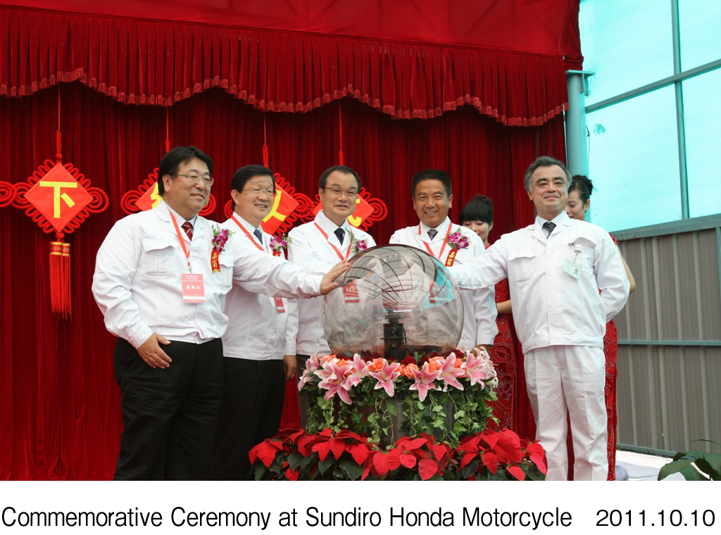 Hondaの中国における二輪車生産・販売合弁会社である新大洲本田摩托有限公司(以下、新大洲本田 総経理:関口 浩)は、2001年の設立から10年経ったことを記念し、本日式典を開催しました。式典には地元政府の方々のほか、Hondaからは、代表取締役 社長執行役員の伊東孝紳、二輪事業本部長の大山龍寛、中国本部長の倉石誠司などが出席しました。