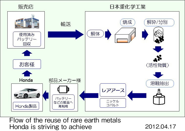 その取り組みの一つとして、Hondaは日本重化学工業株式会社と共同で、国内の販売店や海外から回収した使用済みのハイブリッド車用ニッケル水素バッテリーに含まれるレアアースの抽出を、リサイクルプラントの量産工程で、4月下旬より世界で初めて開始します。