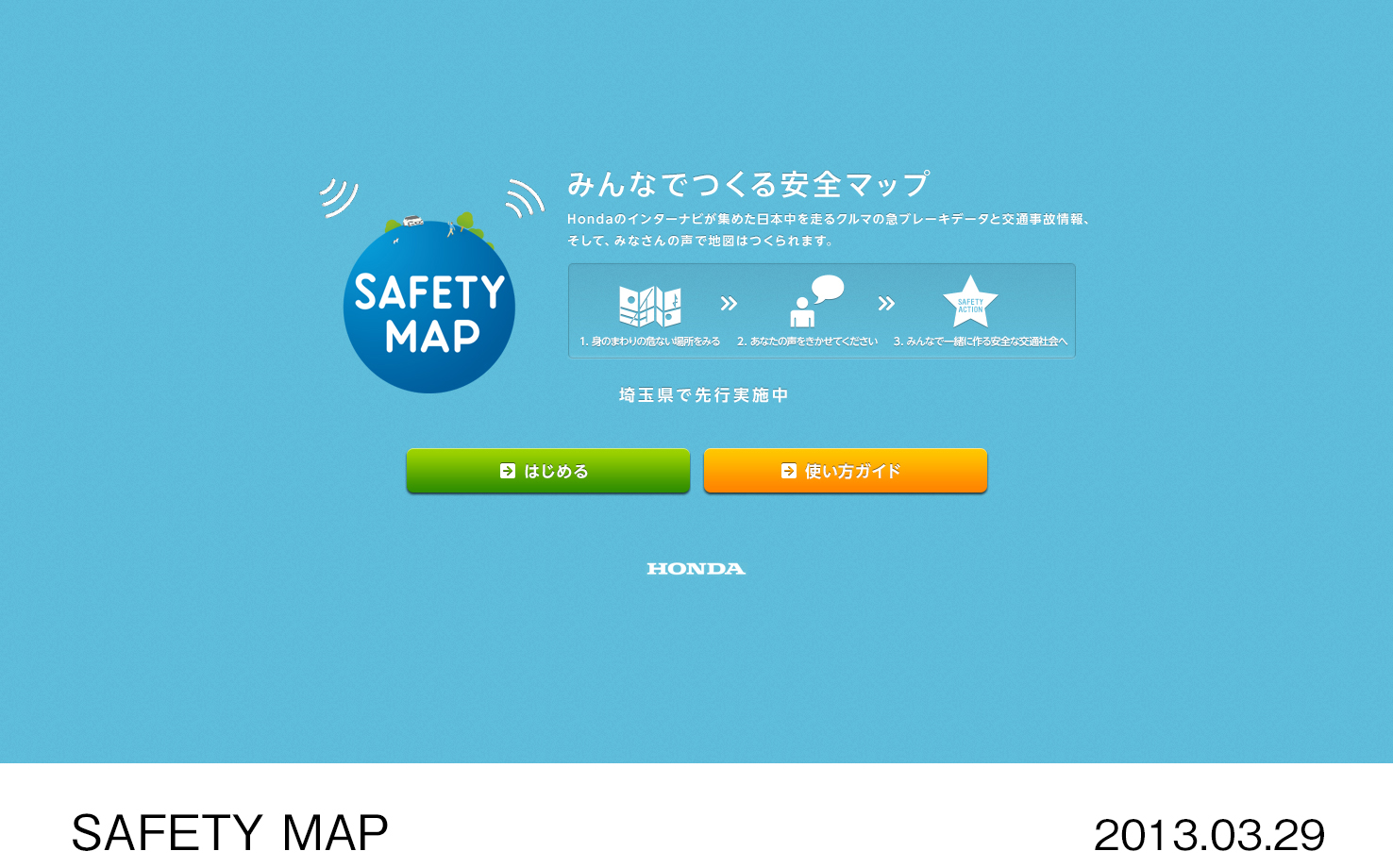 Hondaは、インターナビから収集した急ブレーキ多発地点データと、交通事故情報および地域住民などから投稿される危険スポット情報を地図上に掲載した「SAFETY MAP」を、3月29日(金)に一般公開しました。