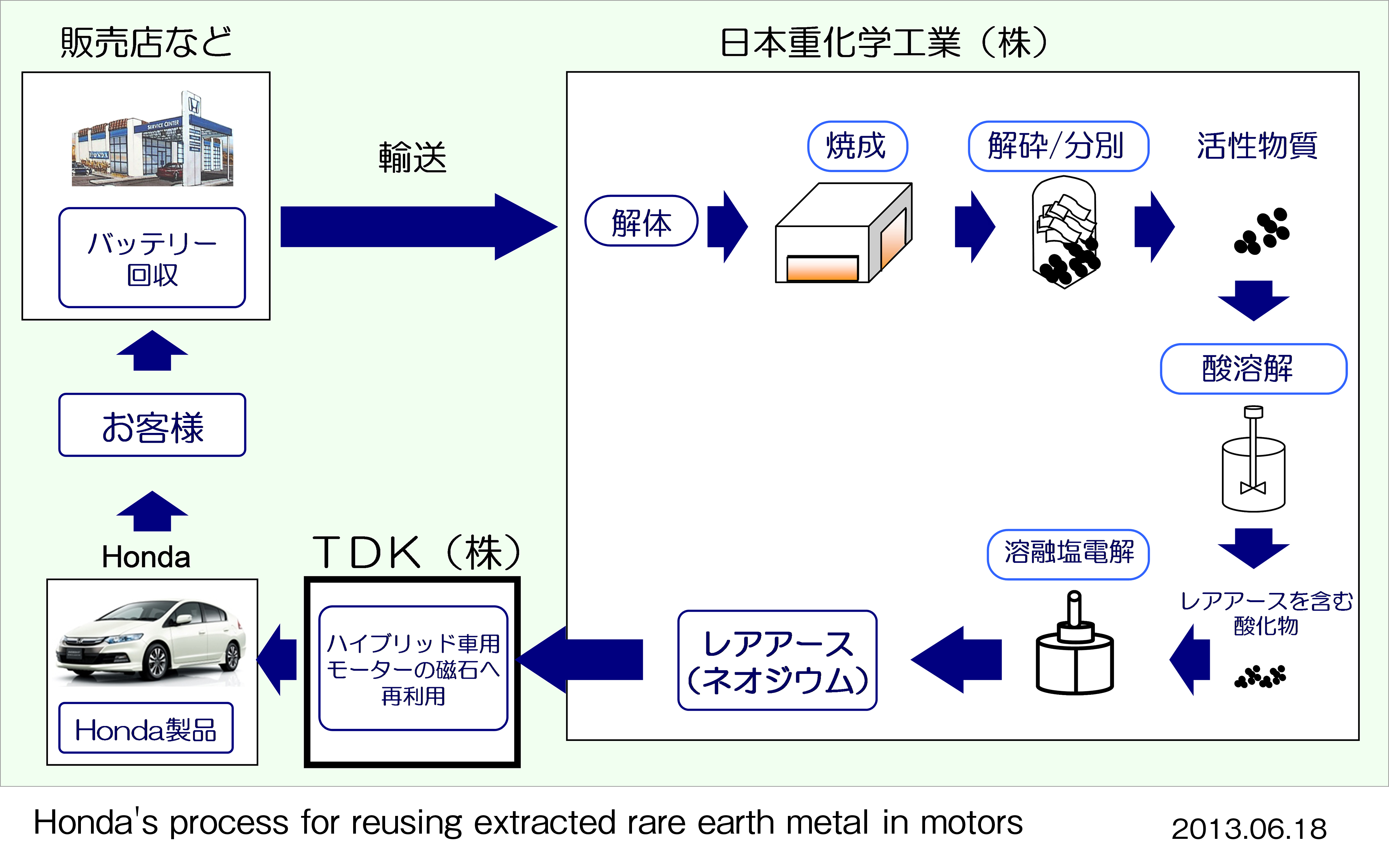 Hondaは、ハイブリッド車用ニッケル水素バッテリーから抽出したレアアースを、ハイブリッド車用モーターの磁石へ再利用する取り組みを、TDK株式会社、日本重化学工業株式会社と共同で推進していくことに合意しました。