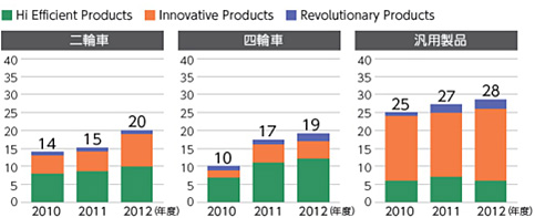 | 「Revolutionary Products」 再生可能エネルギーへの対応やトータルエネルギーマネジメントへの貢献により、CO2排出ゼロ化を目指している製品。電動化対応技術や再生可能エネルギー(水素燃料、太陽電池など)の使用技術を採用。 |