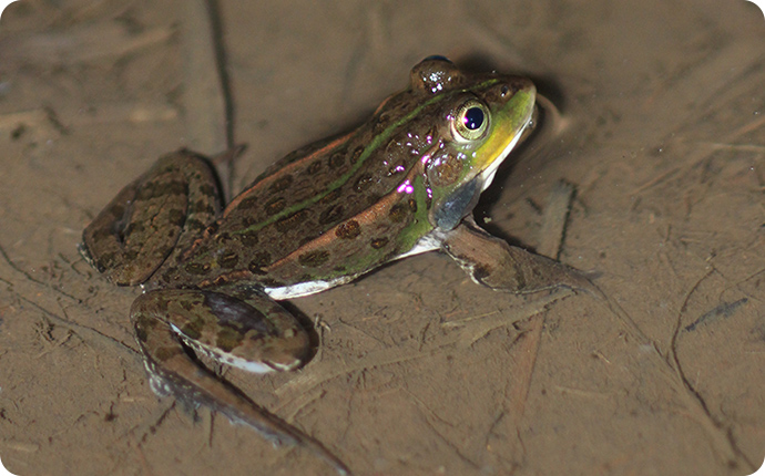 夜の田んぼでまず探したのは、盛んに鳴いてメスを探すオスのカエルです。鳴くことでメスに存在をアピールして、カップルになることを目指しているのです。