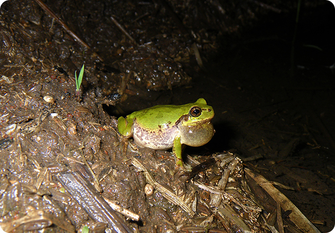 夜の田んぼで鳴くアマガエル