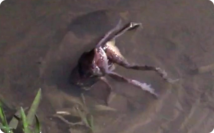 メスが寄ってきたら、オスはメスの上におんぶしてカップル成立です。そのまま田んぼの中に入り、浮きながらオスは腕に力を入れたり、足を動かしたりしてメスに産卵を促します。メスは卵を出す準備ができると腕・足を広げるように伸ばしその後、体をそらせお尻を水面から上に上げるようなポーズをとりお尻の穴から卵が出てきます。その瞬間オスは精子を出し足で受精します。この一連の動きは素早く終わります。卵は一度に10粒くらいで、これを何度も繰り返します。およそ300粒程度何度も場所などを変えて産みます。