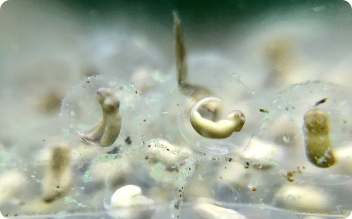 産まれて2日目の卵。早くもオタマジャクシの形が見えてきました