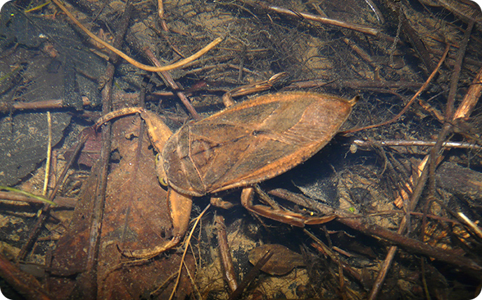 「タガメ」は昆虫類カメムシ目コオイムシ科、体長45~70mm、水の中で暮らすカメムシの仲間です。栃木県にあるモビリティリゾートもてぎには、初夏から夏にかけてこのタガメがごくまれに飛んできます。産卵のために水場を求めてやってくるのです。