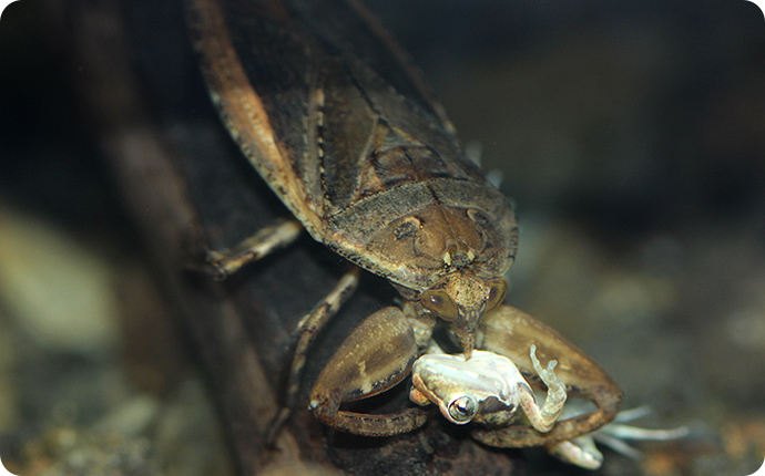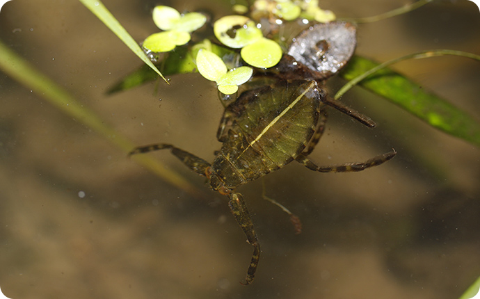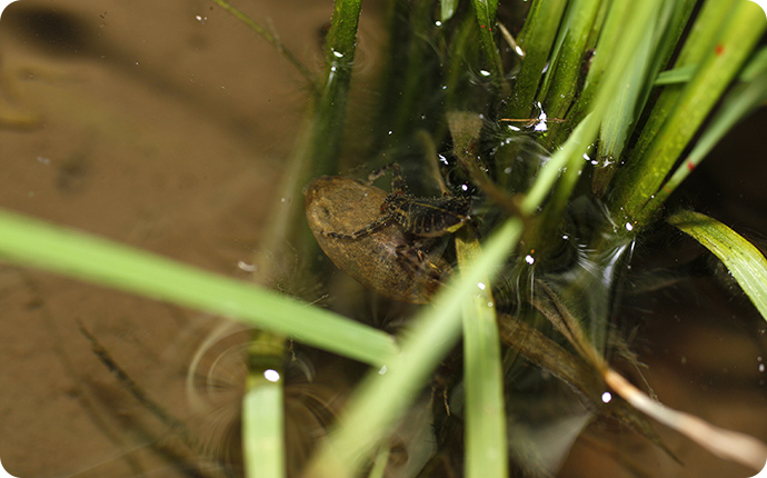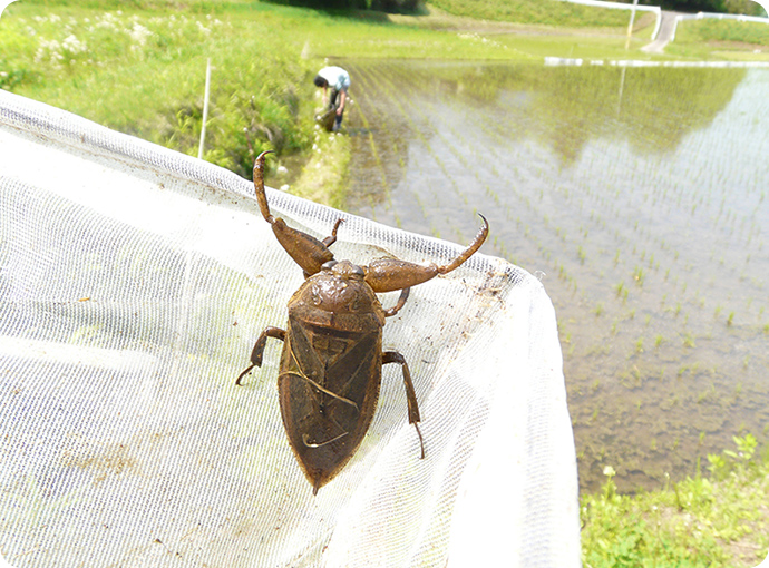 ふ化したタガメは、水に落ちた虫やオタマジャクシなどを捕食し、5回脱皮を繰り返して成虫になります。エサの状況や水温でも差がありますが、成虫になるまでの期間はおおよそ2カ月前後です。しかし田んぼで育つタガメは、共食いでそれほど多くは親になれません。田んぼはエサが多い環境ですが、それでも横にいる仲間をエサにしてしまうのです。