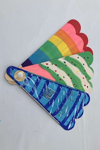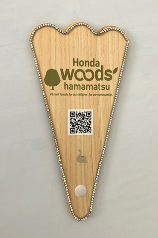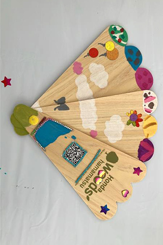 扇子の表紙になる面には、HondaWoods浜松のロゴとHonda環境キッズ“リーフェルものがたり”へつながるサイトのQRコードを印刷し、参加された皆さんに創作を楽しんでいただくと共に、Hondaの環境活動について知って興味を持っていただけるような制作物を目指しました。
