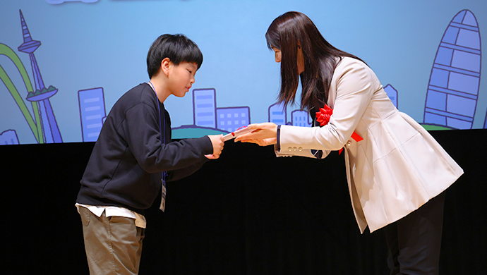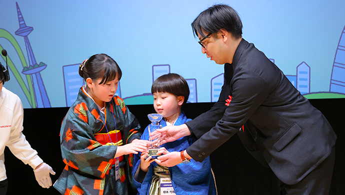 名前を呼ばれた子どもたちは、驚きと喜びをかみしめながらステージに上がり、賞を受け取りました。