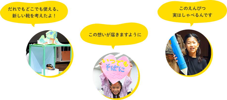 子どもたちはそれぞれの「未来にあったらいいな」という想いを込めた立体作品を前に、