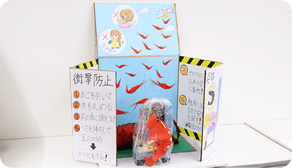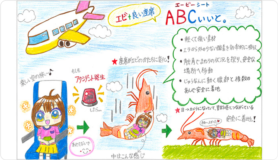 飛行機事故のテレビを見て、「しょうげき防止しせい」がエビの形に似ていると思い、そこからエビのことを調べて思いつきました