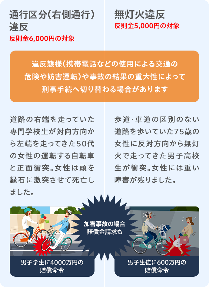 交通ルールを守らず危険な走行をした場合、クルマやバイクと同じようにに次の責任を問われることがあります。