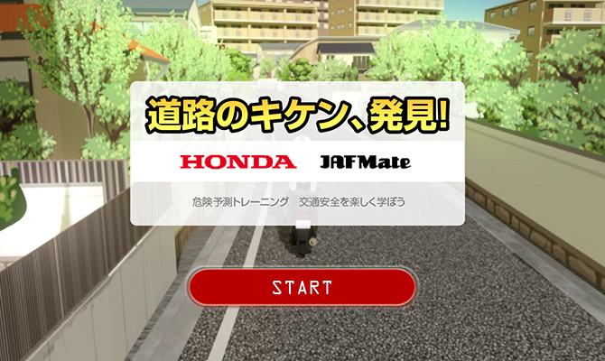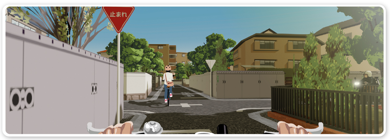 自転車からの視点上は交差点に差し掛かった自転車から見たもので、交差点の手前には一時停止の標識と路面標示があり、軽車両である自転車はそれに従い、停止線の手前で一時停止をする必要がありました。また右側をよく見ると、植込みの間にヘルメットをかぶったバイクに乗る人も見えていました。