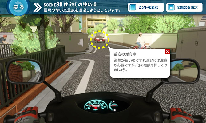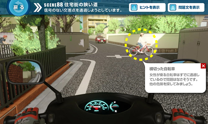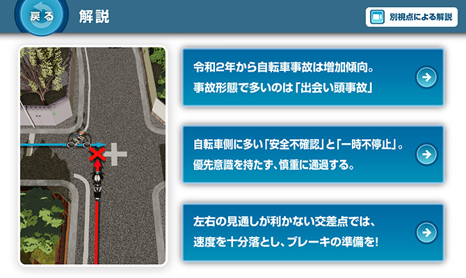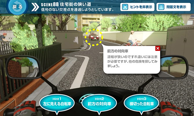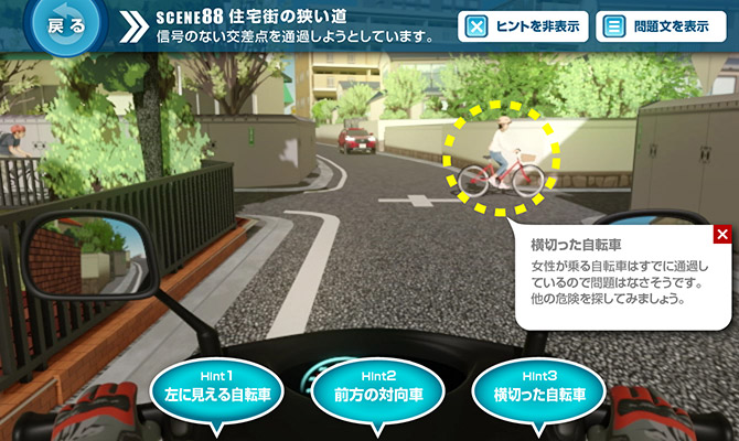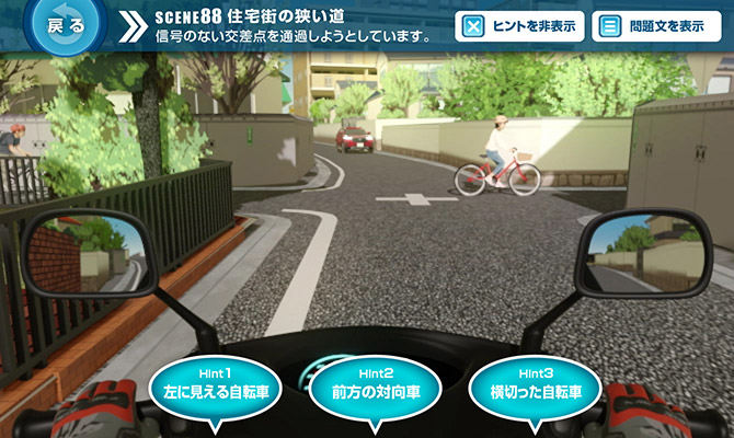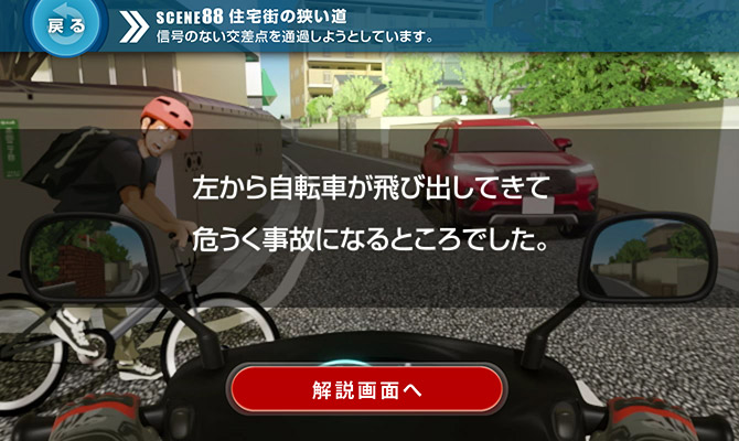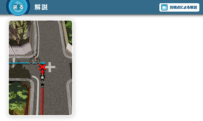 問題場面をよく見ると、左側の植込みの間に自転車に乗る人の頭がわずかに見えていました。それを見落とさないのに加え、「相手がこちらを確認しているだろう」とか「相手が止まるだろう」と安易に考えないことが大切です。