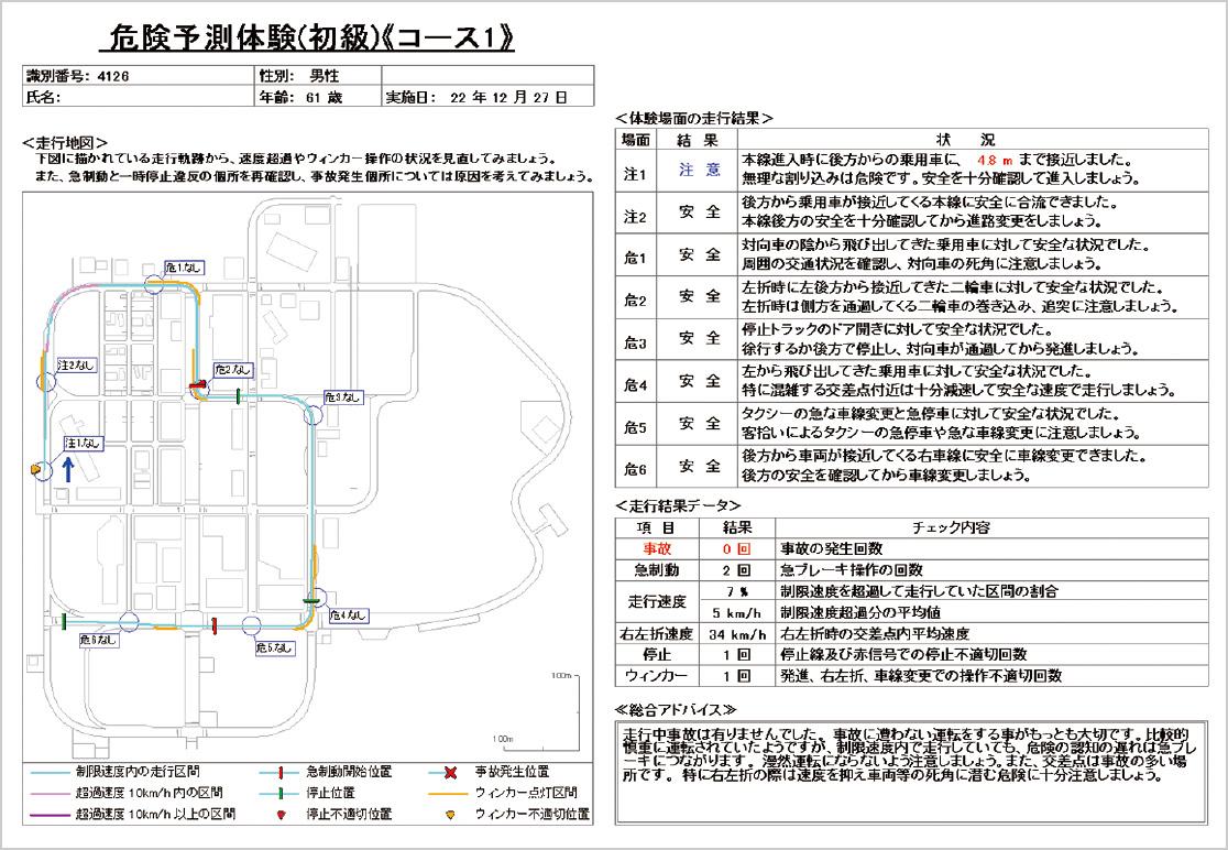 運転反応検査、運転操作課題、危険予測体験、総合学習体験、環境別走行体験、急制動体験などの多彩なメニューを用意しており、実際の自動車運転シーンに近い環境で、認知・判断・操作など運転の現状を数値化することで、各種検査と比較をすることができます。