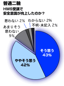 昨年、HMSの受講者と非受講者との比較を郵送によるアンケート調査で行ないました。回答者数は受講者1112人(うち普通二輪214人、大型二輪825人、その他73人)、非受講者431人(うち普通二輪155人、大型二輪242人、その他34人)です。運転技術や安全意識の向上について、普通二輪では「そう思う」が45%、「ややそう思う」を合わせると85%以上の人が向上したと答えています。大型二輪はさらに多くなり「そう思う」が60%を超え、「やや思う」を合わせると90%を超える高い数値になっています。