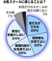 1997年から99年までの3年間の全参加者にアンケートを郵送し235名から回答を得ました。女性インストラクターによる女性のためのスクールについては9割以上の参加者が「良い」と高い評価をしていることがわかります。