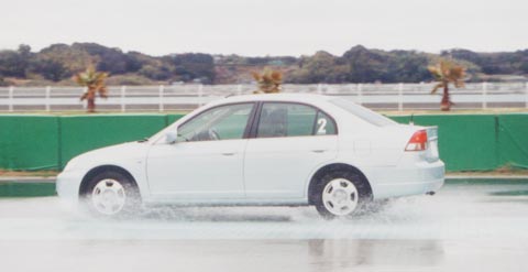 Hondaのハジェト・シンさんは、「いろいろな道路状況が体験できるから、初心者教育にいいんじゃないかな」と言い、画面操作を担当するスタッフをあれこれ質問攻めにしていました。 次はバスに乗ってコースへ。外周、ブレーキング、模擬市街地、四輪車庫入れ、バランス、反応コースと、解説を受けながら順番に見学。インストラクターによるデモンストレーション走行には「すばらしいテクニックだ」と、大きな拍手が起こりました。メモやデジタルカメラで熱心に記録をとる人も。 低μ路コースでは、インストラクターの運転するクルマに同乗して、横滑りを体験するメニューも用意されました。これも希望者が続出。あいにくの雨と強風をものともせず、次々とバスを降りて、体験車に乗り込んでいました。インドネシア二輪産業協会のエディ・コンドロさんは「横滑りが体験できたのは収穫だね。こういう施設をインドネシアにも作れば、事故防止に役立つと思う」と感心した様子でした。