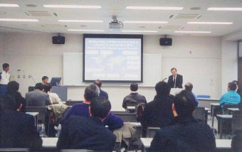 | 概要説明を行なう入野吉勝(株)レインボーモータースクール代表取締役社長 |