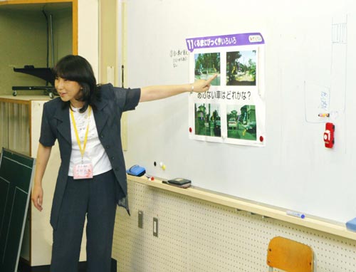 今年4月末から3年生の総合学習の時間に新しい『あやとりぃ』を活用した交通安全の授業を行なっている三重県鈴鹿市立飯野小学校。6月3日午後2時、3年生3クラスの児童を対象に、『あやとりぃ』の授業が始まりました。この日の授業を担当したのは、阿部元子教諭と笠井倫明教諭。