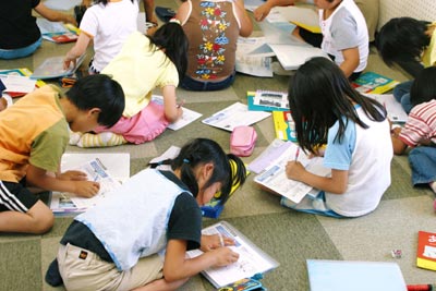 | 授業の最後に『あやとりぃ』のワークシート裏面の「みんなのコーナー」を記入する児童たち |