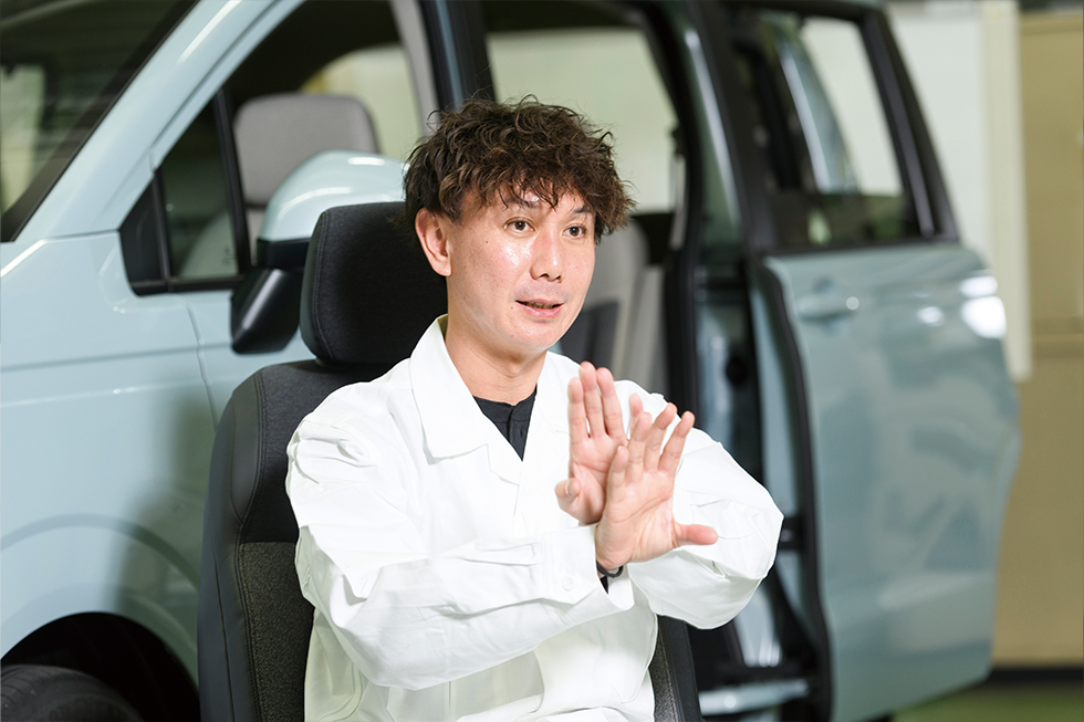 水越:実は入社時の志望はインテリアの設計でした。カッコ良いクルマ、自分が欲しくなるクルマをつくりたいという想いがありまして。内装を志望してシートに配属されたわけですが、やってみると人が常に座っているものなので、ダイレクトにお客様の感想を聞くことができて、とてもやりがいのある仕事です。他部品の設計を担当したことがないので比較はできませんが、今はシートに配属されて良かったと思っています。