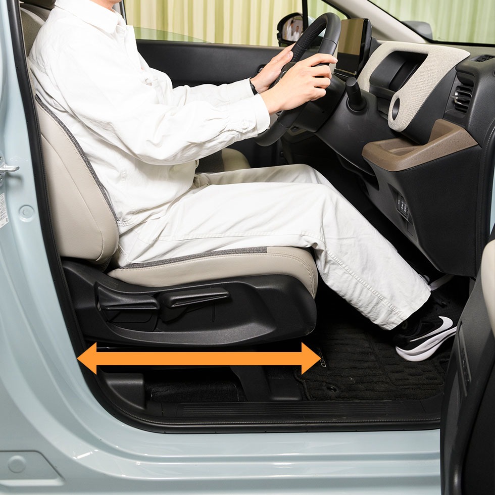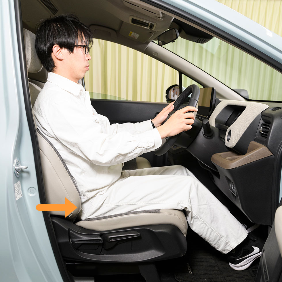 ドライバーは、緊急時にブレーキをグッと力を入れて踏める必要があります。まずはグッと踏み込めるように、シートの前後位置を設定します。ドライバーが疲れにくいポジションにしつつ、緊急時にはブレーキを踏み込めるようにシート位置を前後に調整してください。