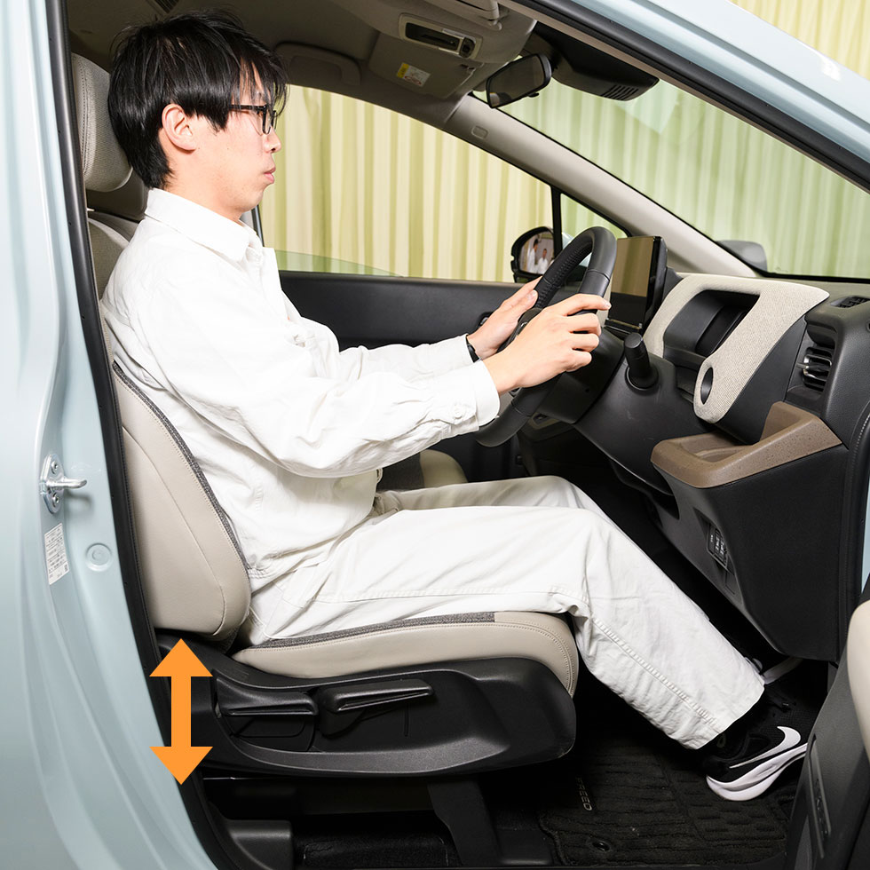 シートの高さ調整も重要です。座面の高さを変えると、目の位置が変わり、視界もかなり変わります。適切な目の位置に高さを調整すると、車幅感覚、そしてクルマの前端を正しく把握しやすくなります。