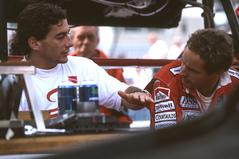 私が最初にアイルトン・セナを見かけたのは、1983年のイギリス/ヨーロッパF3選手権のシルバーストン戦だった。私は、ウエストサリー・レーシングのディック・ベネットから前年モデルのマシンを購入していたが、あのサーキットでギヤレシオをどうセットアップしていいのか分からなかったから、彼のチームを訪ねて助言を求めに行った。そうしたら当時、彼のチームで走っていたアイルトンが、ツールボックスに座ってやはりギヤレシオについて勉強していた。次に実際にアイルトンと初めて話をしたのは、マカオGP後のパーティーの席だった。でも、お世辞にも友好なムードではなかったね。あのレースのファステストラップは実際には彼が記録したのだが、計測に問題があって公式には私のものとなっていた。そのことが納得できないアイルトンは、その席で私に詰め寄ってきたんだ。もちろん、計測間違いは知っていたけど、知らないふりをしたよ。彼は優勝とポールポジションに加えてファステストラップの記録も欲しかったんだろう。彼が妥協のない野心を持っていたことは、この時知ったというわけさ。私たちは基本的に同世代で、当時お互いにF1のニュースターだった。アイルトンがロータスにいて私がフェラーリにいた頃(1987年)は、ほぼ同じレベルで戦っていた。彼が勝てば、次は私が勝つといった具合だ。マクラーレンに移籍するまで、私は誤った認識を抱いていた。これまでのチームメイトには常に勝っていたから「アイルトンが次に倒す相手だ」と当然考えていた。私は、彼の本当の強さを見くびっていたんだ。
