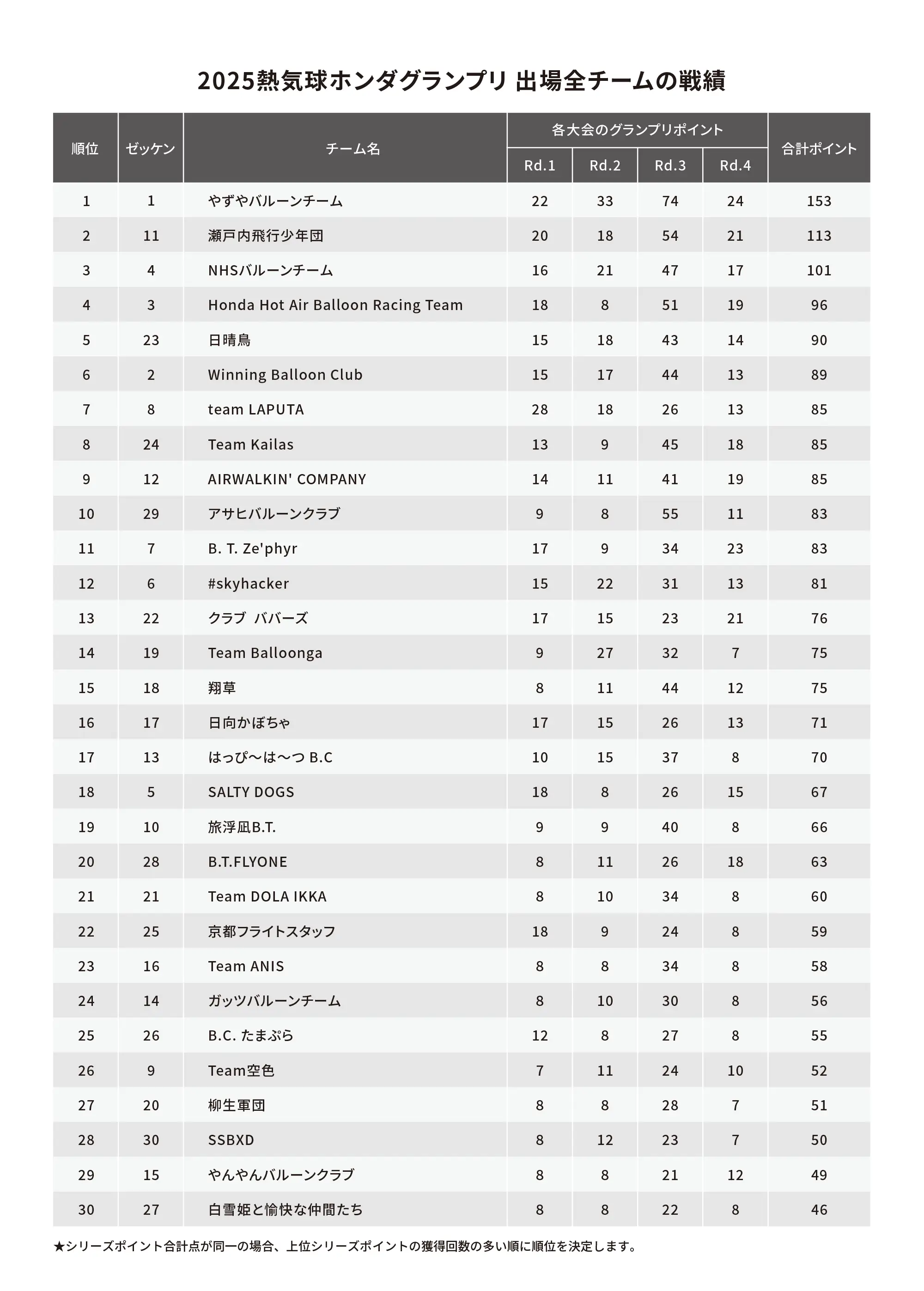 やずやバルーン チームが9連覇を達成しました。Honda Hot Air Balloon Racing Team は総合成績4位。