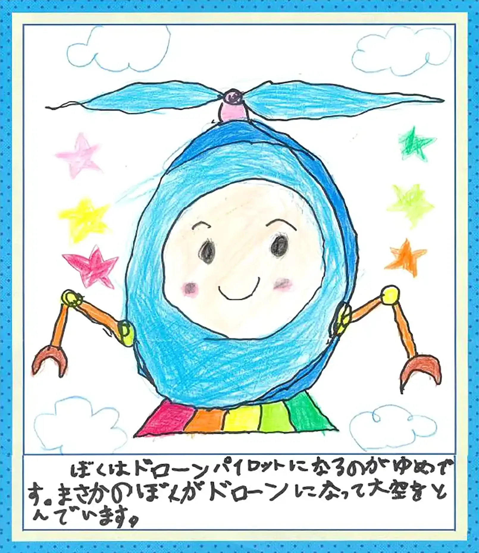 ドローンパイロットになりたいという夢を、自分自身がドローンになって空を飛んでいるイラストにしてくれました。