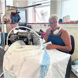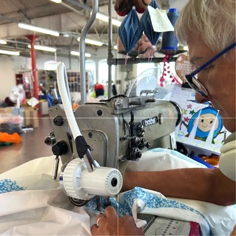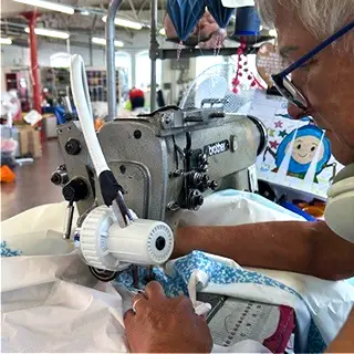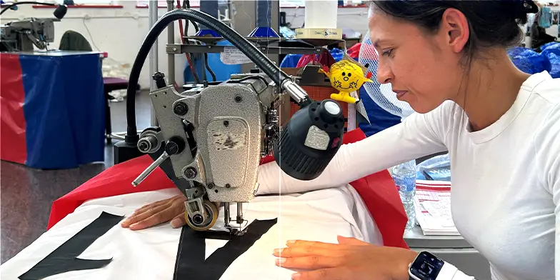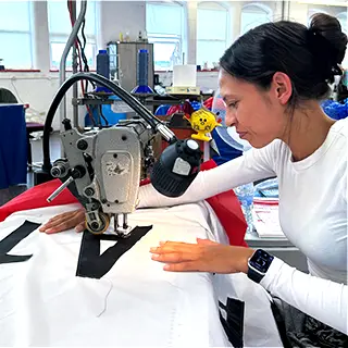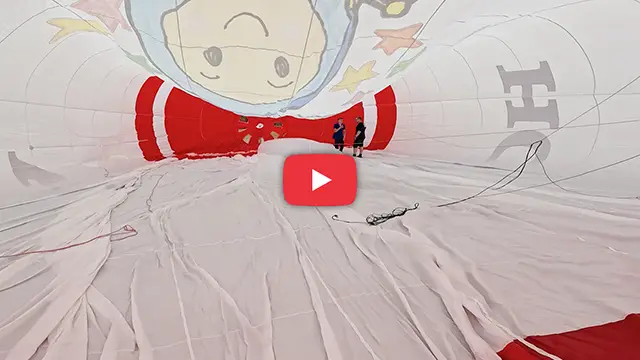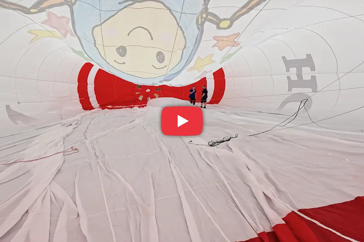 全体のデザインは、中村さんの夢を描いたイラストとHondaのロゴを際立たせたシンプルなもので、Hondaのチャレンジングスピリットを象徴する赤いラインが大胆に描かれています。イラストは、パーツごとにナイロン生地に印刷され、クレヨンのタッチまで繊細に再現。高さ約22m、建物でいうと7階ほどの高さになる機体は、たくさんのパーツでつくられますが、まるで縫い上げてから描いたと思えるほどイラストが正確につなぎ合わされていることに驚かされます。すべてミシンを用いた手縫いで、見事な熟練の技。完成したのちに検査のために膨らませるシーンが映像に収められているので、ぜひご覧ください!