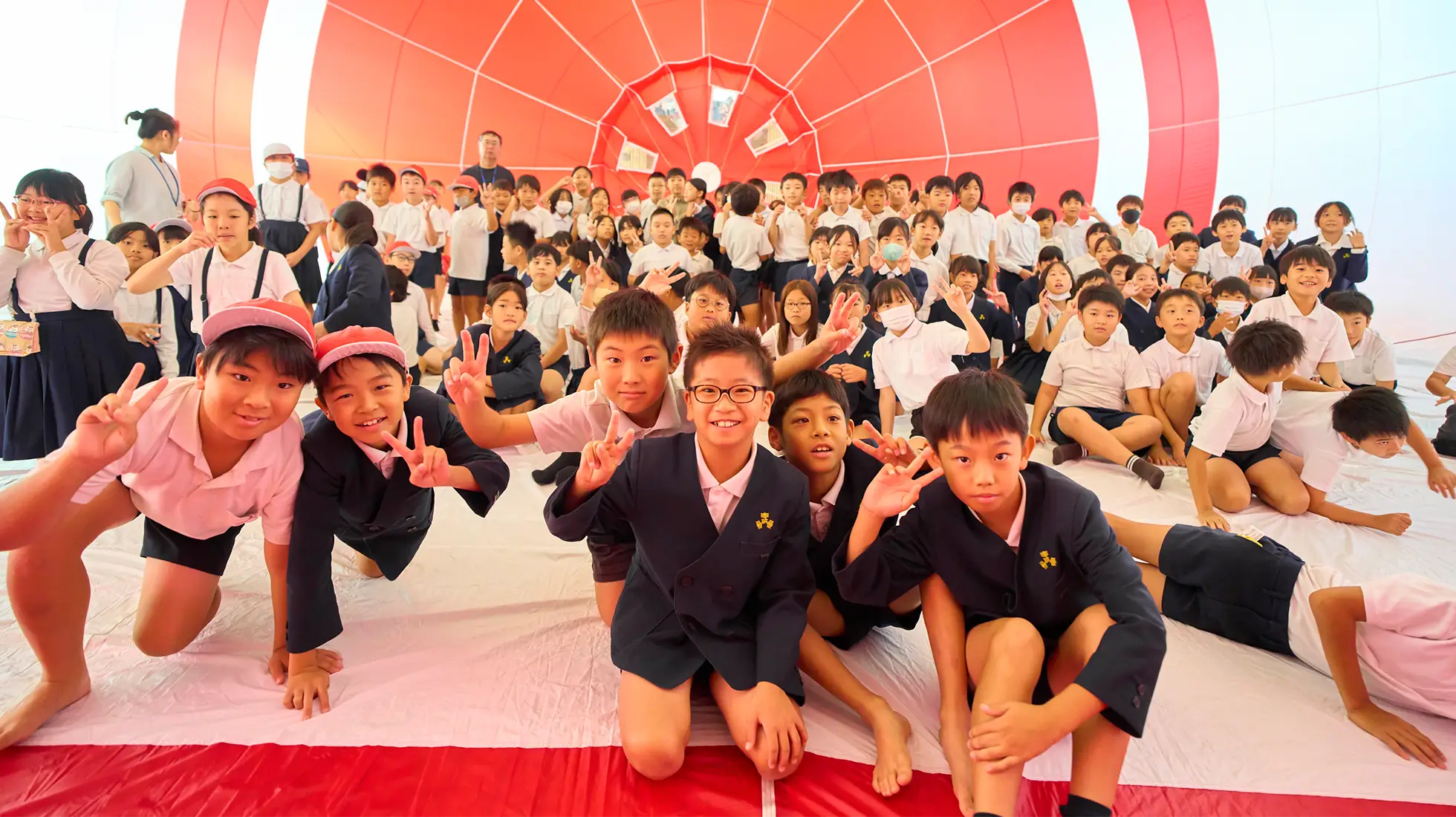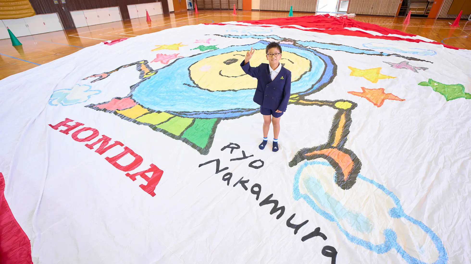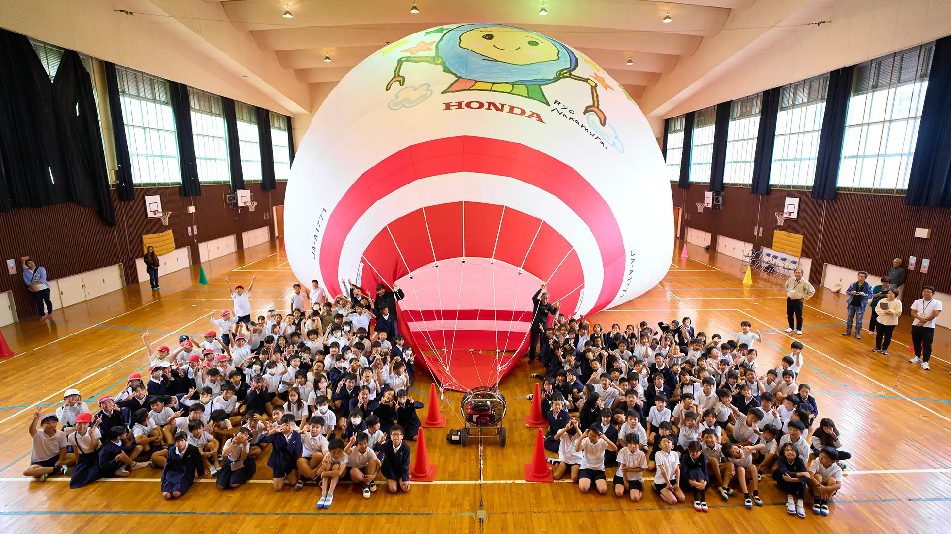 Hondaは、そんな思いで浜崎小学校でのお披露目式典を開催。当日は風の影響で校庭での機体の立ち上げではなく、体育館で膨らませるお披露目となりましたが、参加した皆さんは「熱気球の機体の中に入る」という貴重な経験ができました。