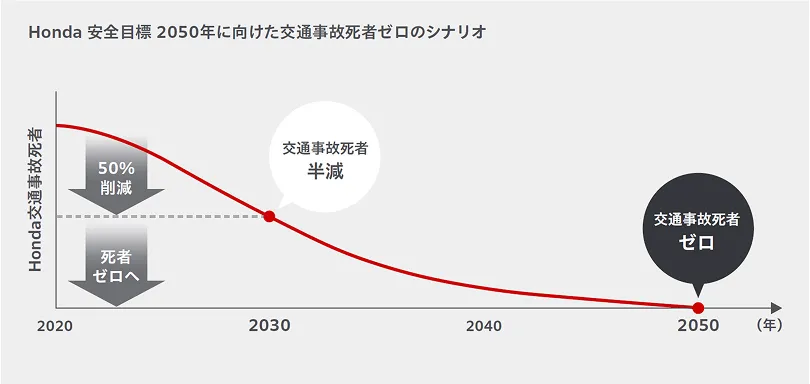 - Hondaは、2050年に全世界でHondaの二輪車、四輪車が関与する交通事故死者ゼロを目指している