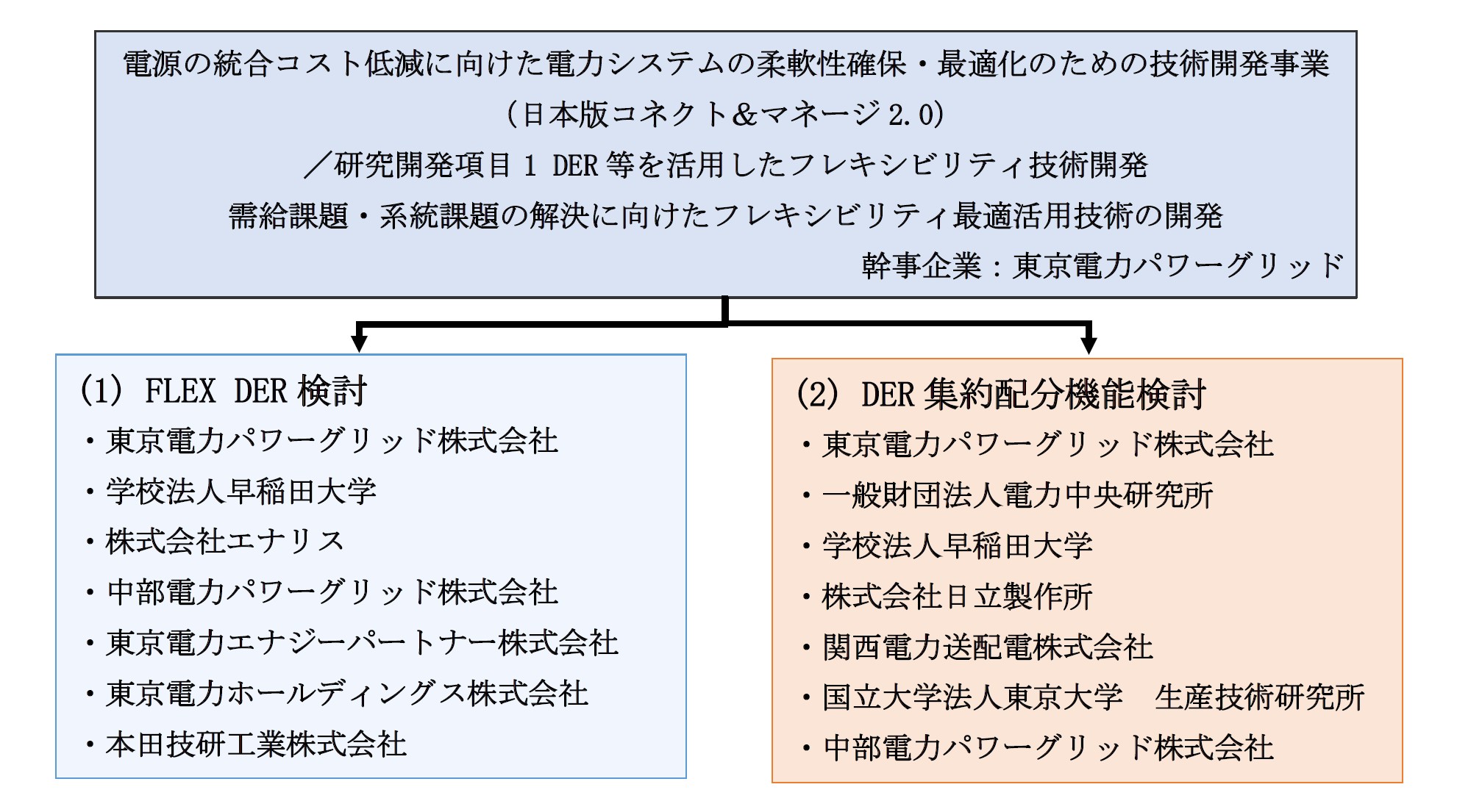 東京電力パワーグリッド株式会社、一般財団法人電力中央研究所、学校法人早稲田大学、株式会社エナリス、株式会社日立製作所、関西電力送配電株式会社、国立大学法人東京大学 生産技術研究所、中部電力パワーグリッド株式会社、東京電力エナジーパートナー株式会社、東京電力ホールディングス株式会社、本田技研工業株式会社の11者は、国立研究開発法人新エネルギー・産業技術総合開発機構(以下、「NEDO」)が公募した「電源の統合コスト低減に向けた電力システムの柔軟性確保・最適化のための技術開発事業(日本版コネクト&マネージ2.0)※1/研究開発項目1 DER等を活用したフレキシビリティ技術開発」(以下、「本事業」)に応募し、採択されたため、7月1日より事業を開始いたしました。