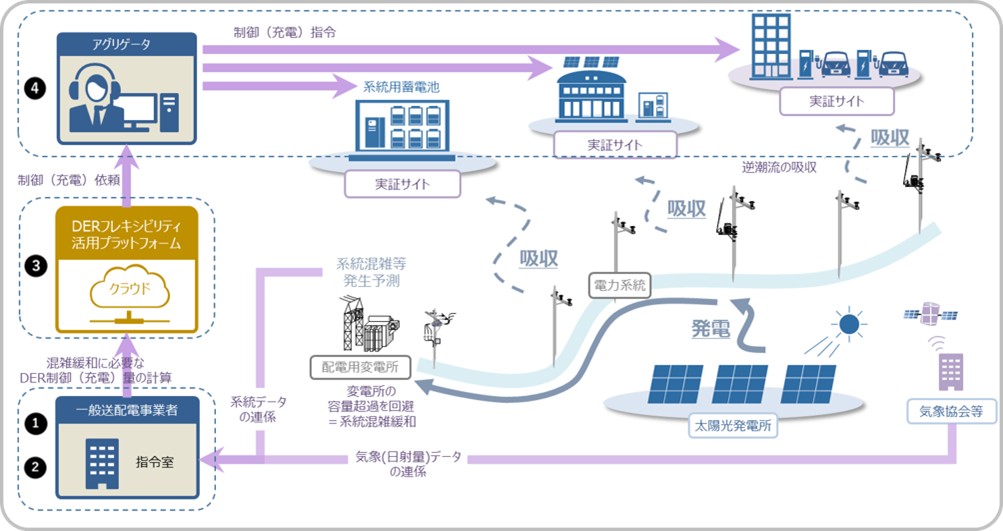 図2では、太陽光発電所にて発電された電気は配電系統から配電用変電所に流れるが、これに伴って系統混雑の発生が予測される場合、①・②一般送配電事業者の指令室では、混雑緩和に必要なDER制御(充電)量の計算を行う。③DERフレキシビリティ活用プラットフォームでは、一般送配電事業者から混雑緩和に必要なDER制御(充電)連絡を受け、アグリゲーターへ制御依頼を行う。④アグリゲーターはプラットフォームからのDER制御(充電)依頼を受け、系統用蓄電池などの実証サイトへDER制御(充電)の指令を行う。本事業を通して、このようなDERフレキシビリティ活用の形を実現していく。