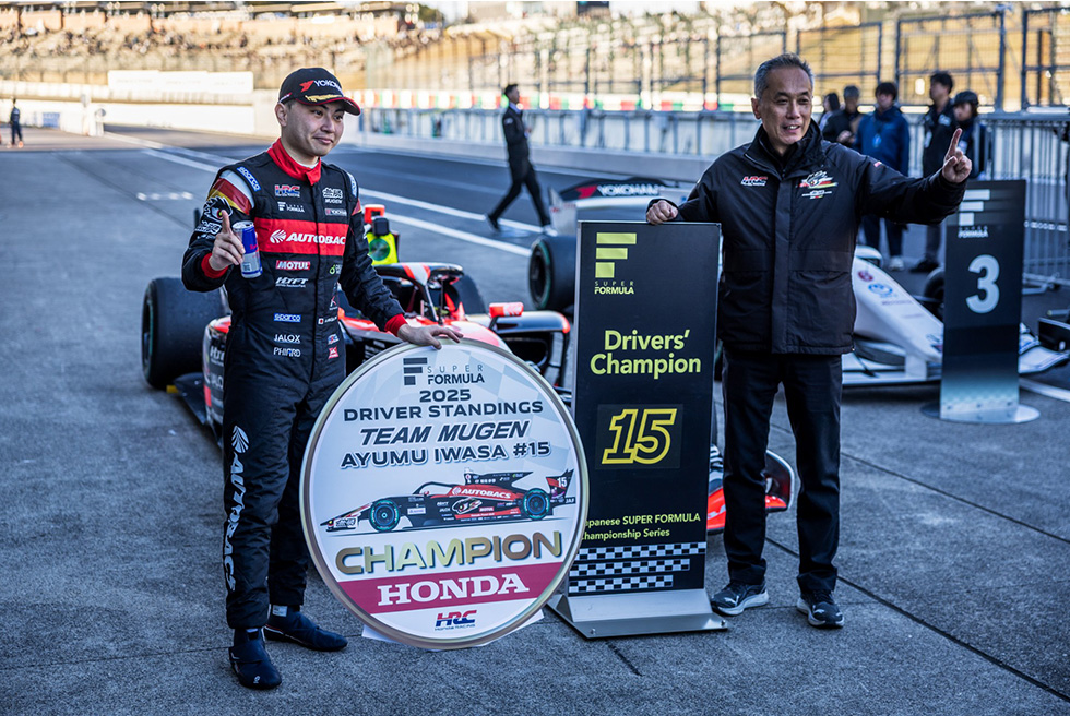 11月23日(日)に鈴鹿サーキット(三重県鈴鹿市)にて、2025年全日本スーパーフォーミュラ選手権(SUPER FORMULA)の最終戦となる第12戦が開催され、TEAM MUGEN(チーム・ムゲン)から参戦しているHondaドライバーの岩佐歩夢(いわさあゆむ)選手がポール・トゥ・ウインで今季2勝目を挙げ、参戦2年目で自身初となる年間ドライバーズチャンピオンを獲得しました。