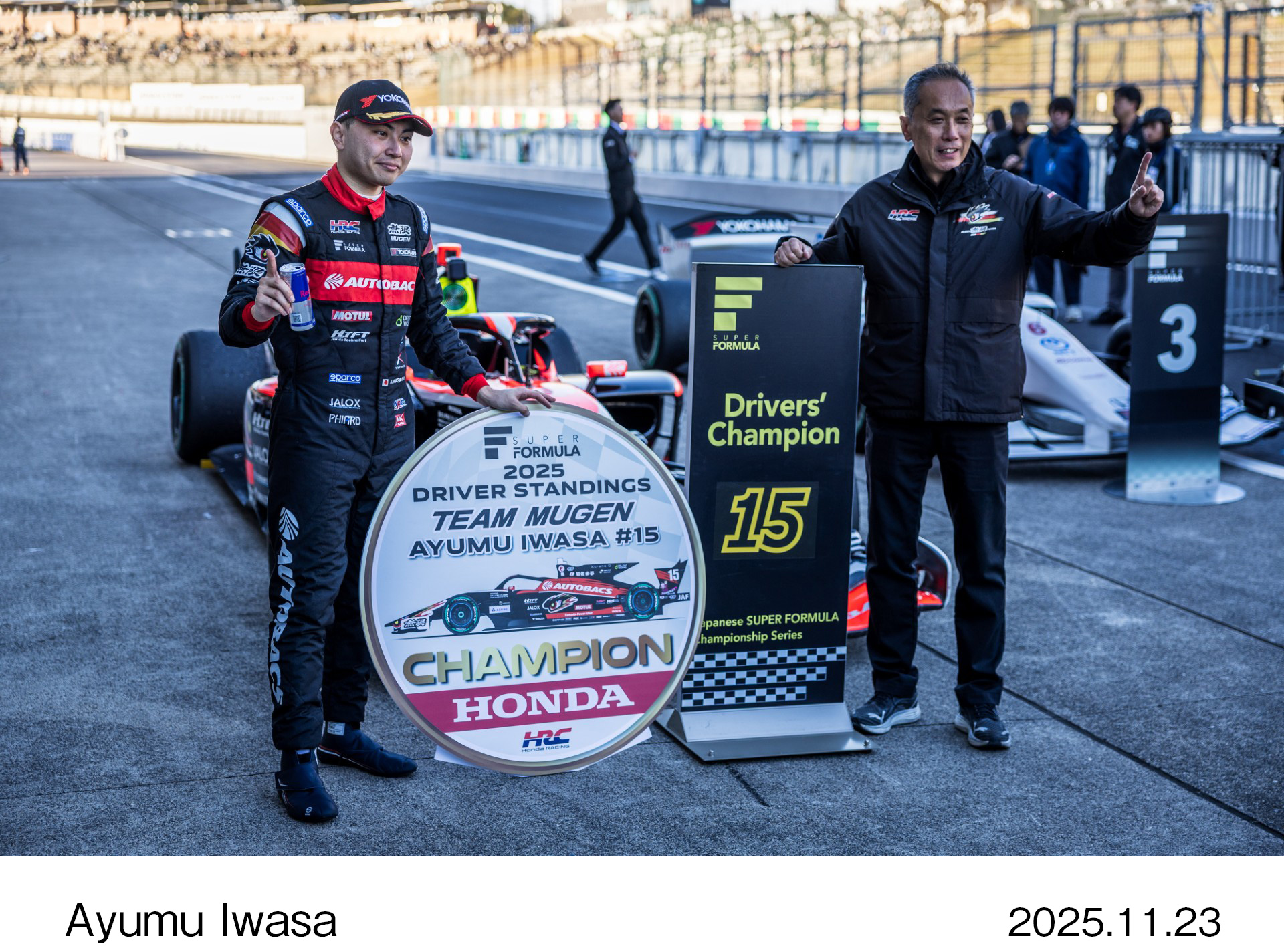 「岩佐歩夢選手がドライバーズチャンピオンを獲得でき、大変うれしく思います。これは岩佐選手とTEAM MUGENみんなの頑張りによるものです。思うような結果につながらなかった時も、岩佐選手自身のチームをつくるという意識で一丸となり全員で努力した結果、タイトル獲得を果たしました。さらに上を目指して、強いチームづくりに励んでまいります。シーズンを支えてくださったスポンサーの皆様、Honda/HRC、そしてファンの皆様に心より感謝申し上げます」