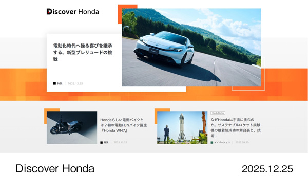 Hondaは本日、製品や技術・デザインとそれらに対する開発者の思い、環境や安全・社会貢献などさまざまな企業活動、そしてモータースポーツなど、Hondaの幅広い取り組みをまとめてわかりやすく伝えるキュレーションメディア「Discover Honda(ディスカバー ホンダ)」をHondaの企業情報サイト※1上で公開しました。
