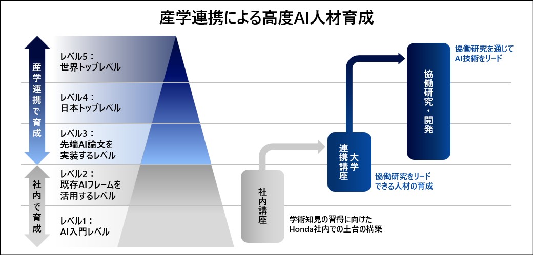 2026年4月より、慶應義塾大学と大阪大学の大学院生およびHondaの技術者を対象に開設します。3者が大学の研究者と企業のエンジニアの立場から教育に参画し、それぞれの特性を生かして理論と実践を往還しながら「今、世界で通用するAI技術」を学べる環境を構築します。本講座を通じて、学術界と産業界の双方を理解し、将来のAI研究・開発・社会実装を牽引できる高度AI人材の育成を目指します。