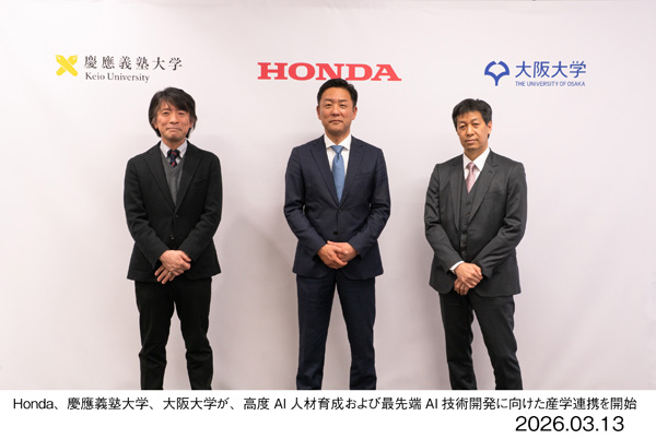 本田技研工業株式会社(以下、Honda)、慶應義塾大学、および国立大学法人 大阪大学大学院情報科学研究科(以下、大阪大学)の3者は、2026年4月より高度AI人材育成を目的とした連携講座を開設するとともに、最先端AI技術の研究開発を行う協働研究所を設置し、稼働を開始します。本産学連携では、両大学が有する最先端の学術知と、モビリティ分野を中心にさまざまな技術の社会実装を行ってきたHondaの知見を融合させ、AI技術の研究開発から実装までを一体で推進することで、次世代AI人材の育成と日本の産業競争力の強化を目指します。