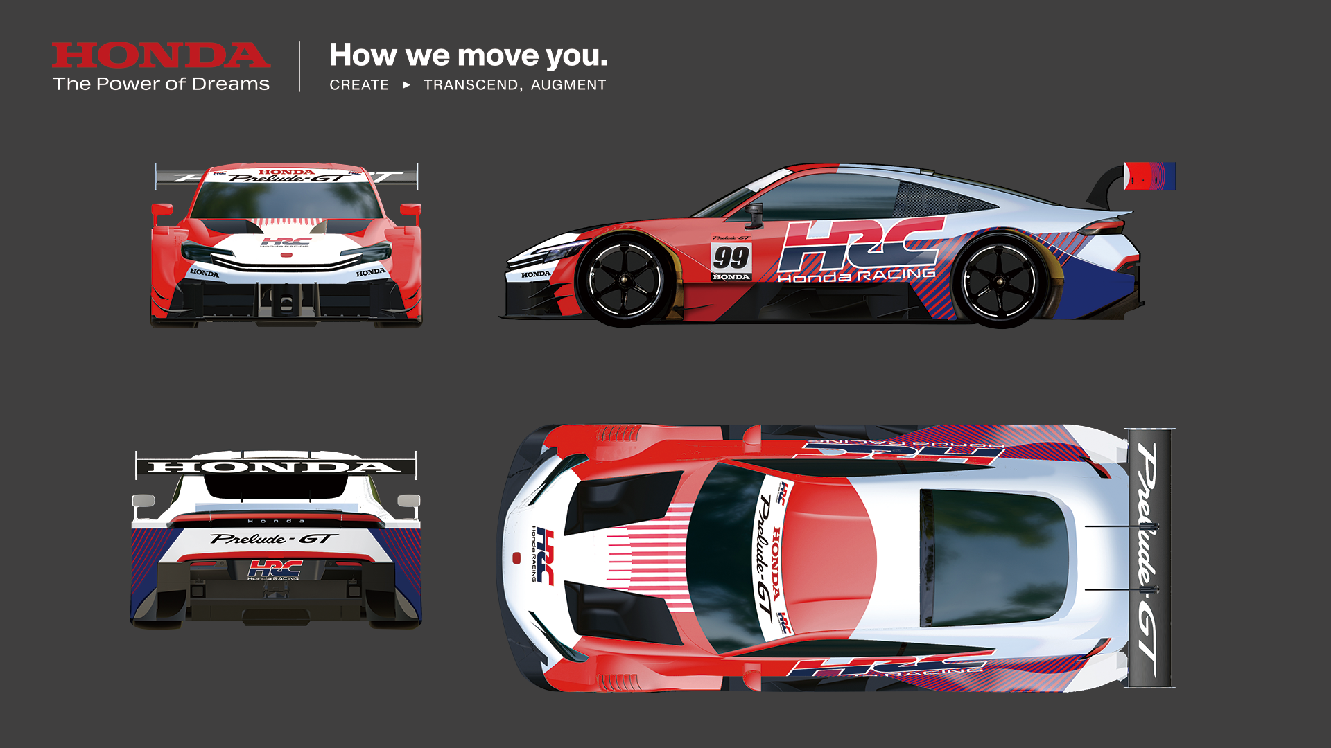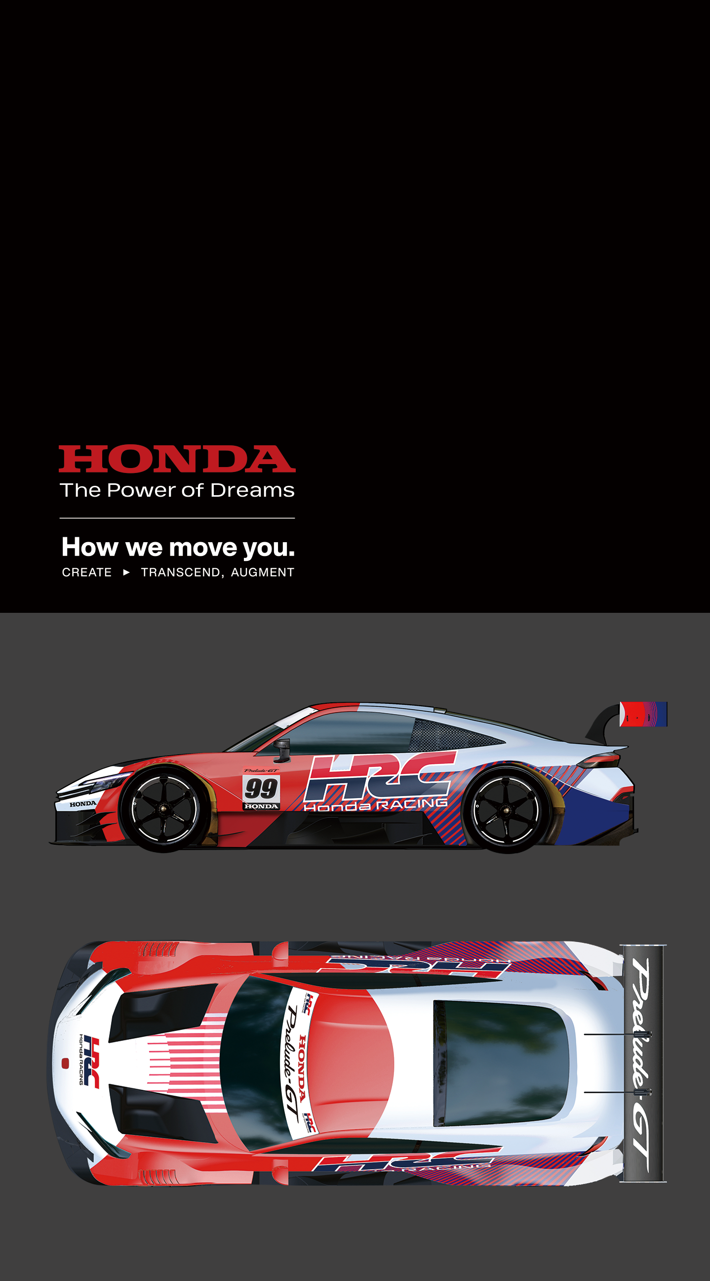『Honda HRC PRELUDE‑GT』に採用されたHRCのリバリーデザインは、円弧を生かしたデザインとトリコロールのカラーリングによって、ブランドが持つ価値を端的に表現しています。このデザインは、Hondaが過去から現在へと継承してきたモータースポーツスピリットを、明確かつ一貫したかたちで伝えるものです。