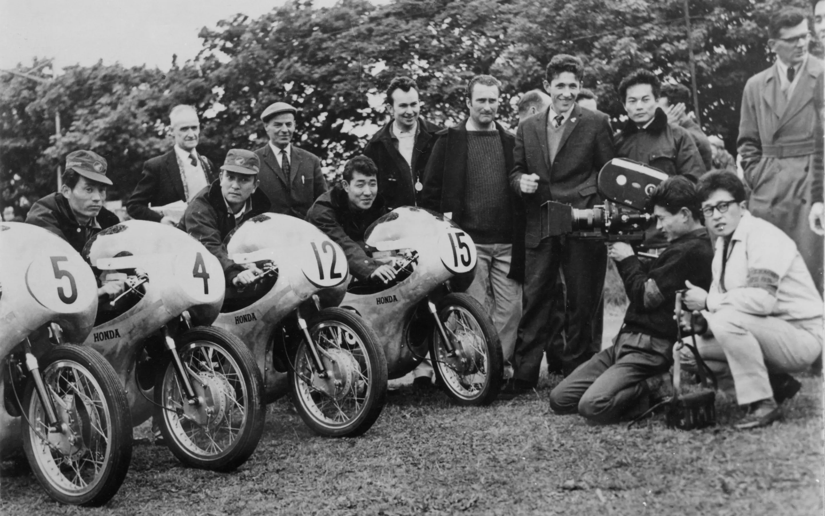 1954年3月、Honda初の製品である自転車用補助エンジンの生産を開始してから7年足らず、本田宗一郎は当時世界最高峰のレースと言われた二輪ロードレース世界選手権のマン島TTレースに参戦することを宣言。その言葉通り1959年に125ccのRC142で初出場を果たした。わずか2年後の1961年にはこのウイングマークがあしらわれたRC143にまたがったマイク・.ヘイルウッドが優勝。それにとどまらず、同年Hondaは125ccクラス、250ccクラスにて世界GPのチャンピオンを獲得したのだった。