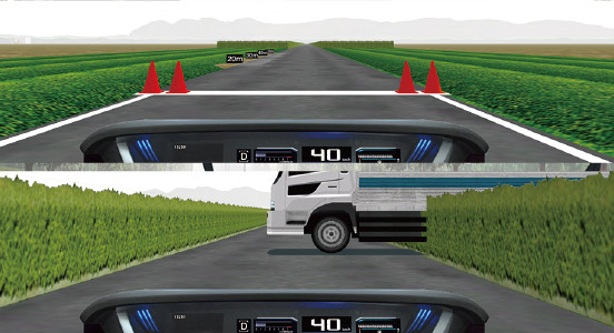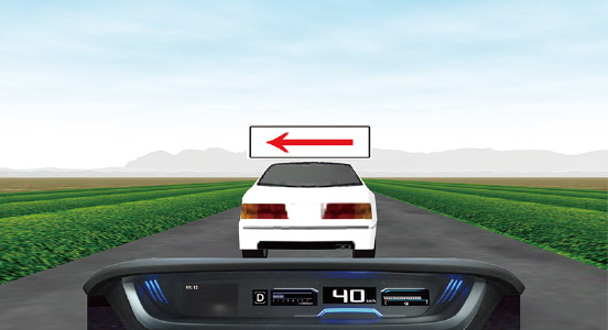 運転操作課題メニューでは、3面液晶モニターを使用し3種類のマークを表示して指定されたコースを走行します。